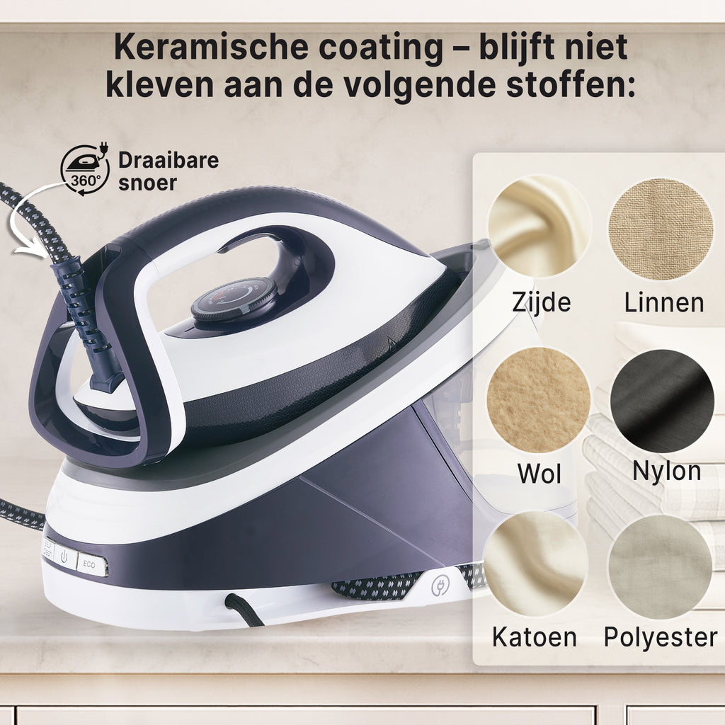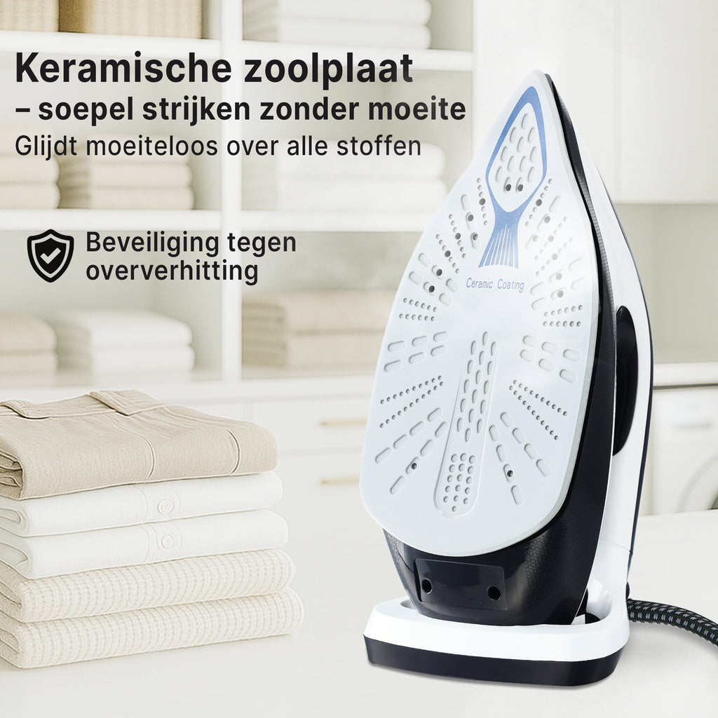 De keramische coating van de zoolplaat zorgt ervoor dat het strijkijzer moeiteloos over alle soorten stoffen glijdt. Of je nu een delicate zijden blouse strijkt of een stevige linnen broek, de zoolplaat blijft soepel bewegen en voorkomt dat kleding blijft plakken of beschadigt. Perfect voor dagelijks gebruik en geschikt voor alle textielsoorten.