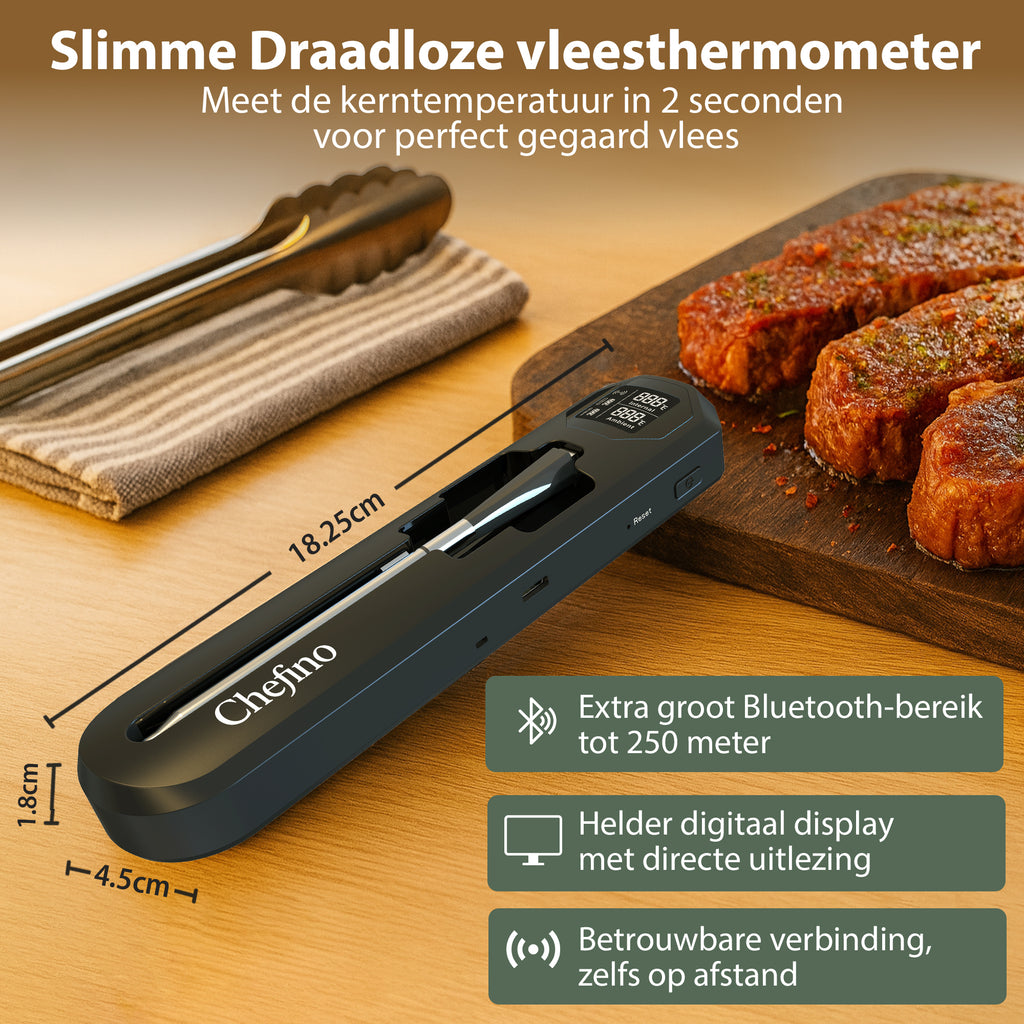 Sta je vaak in de keuken of achter de BBQ en vraag je je af of het vlees nu écht gaar is? Veel thuiskoks vertrouwen op hun gevoel of snijden stukken vlees open om de garing te controleren. Het resultaat: sappige vleessappen lopen eruit, de structuur gaat verloren en je houdt vaak een droog of ongelijkmatig gegaard stuk vlees over. Precies hier komt de Chefino Slimme Draadloze Vleesthermometer in beeld – dé oplossing voor iedereen die met vertrouwen perfect vlees op tafel wil zetten.