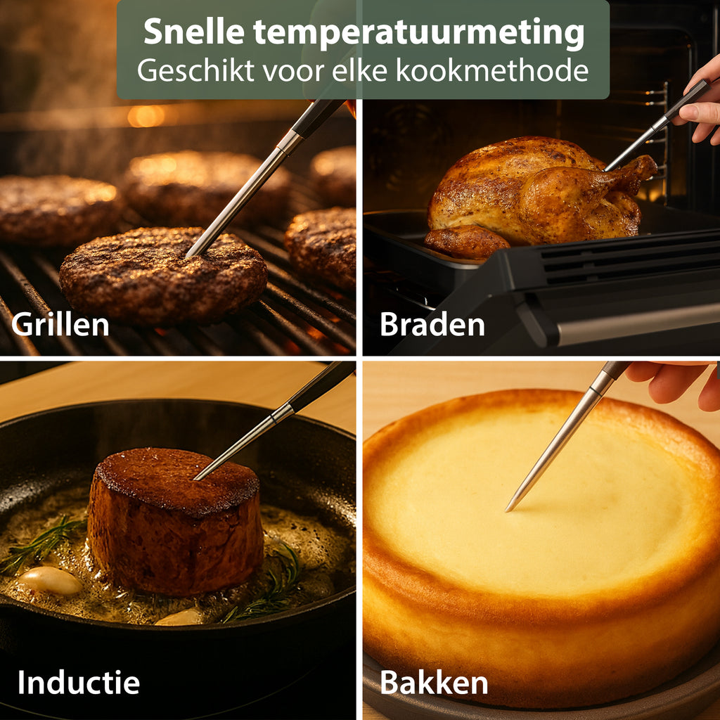 Geschikt voor grillen, braden, bakken, BBQ en zelfs voor het bereiden van taarten of ovengerechten. Eén thermometer die je voor al je kookmethodes kunt inzetten.
