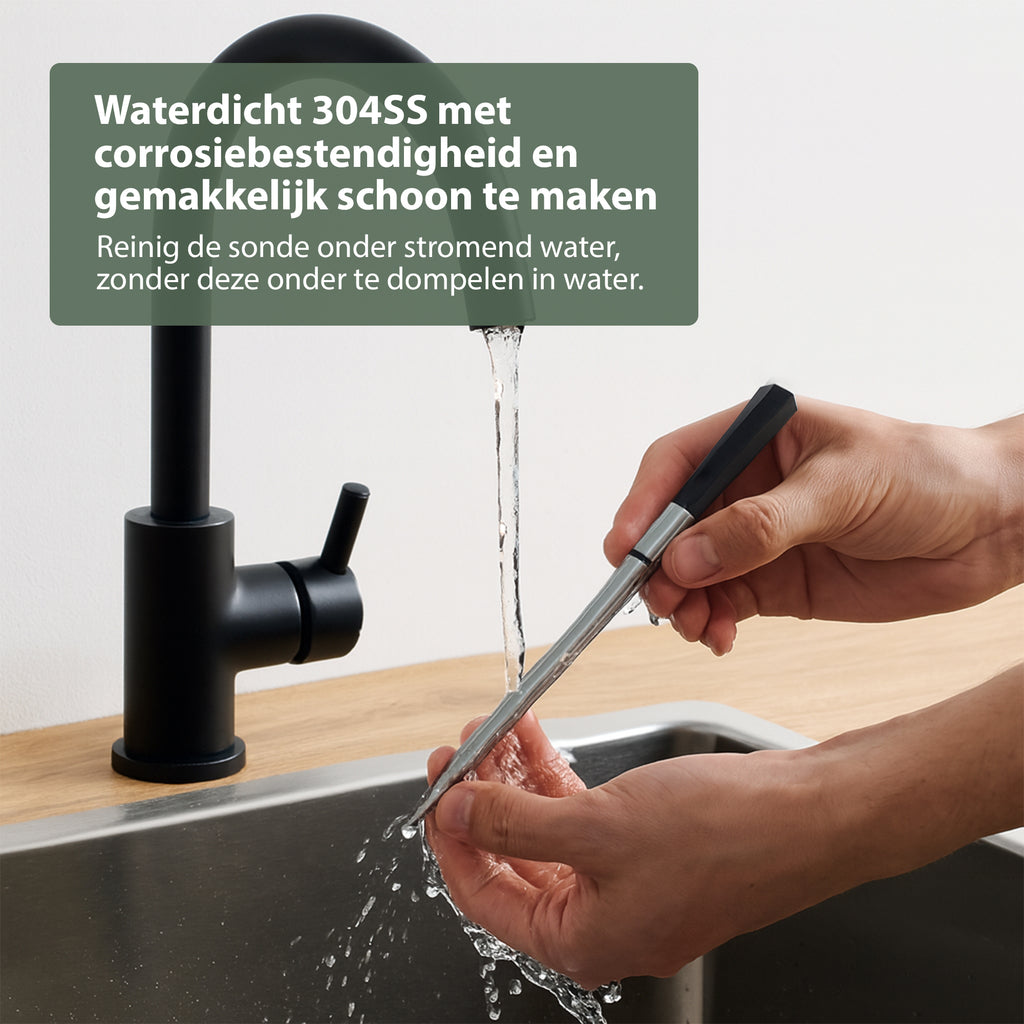 De sonde is gemaakt van hoogwaardig 304 roestvrij staal (RVS) en is volledig waterdicht. Je spoelt hem eenvoudig af onder de kraan, zonder dat vuil of bacteriën achterblijven.