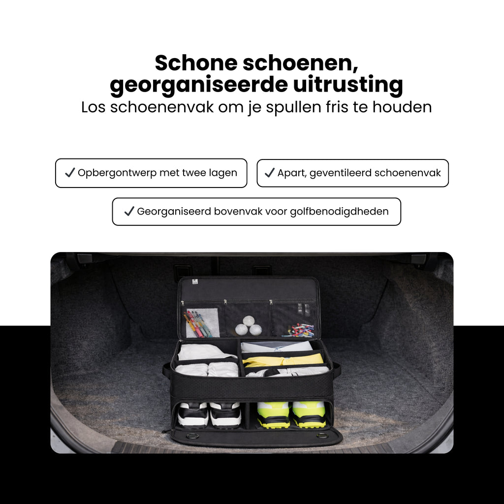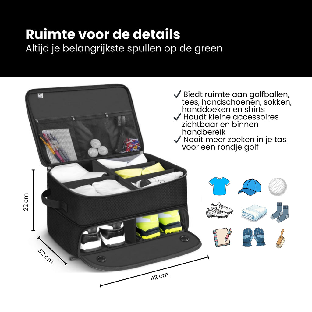 Veel golfers herkennen het probleem: handschoenen liggen los in de auto, tees verdwijnen in vakjes, golfballen rollen rond en schoenen zitten apart in een tas die je weer moet zoeken. Het resultaat? Stress vóór je ronde en een rommelige start van je spel. Bovendien raken accessoires sneller beschadigd of kwijt wanneer alles los wordt vervoerd.