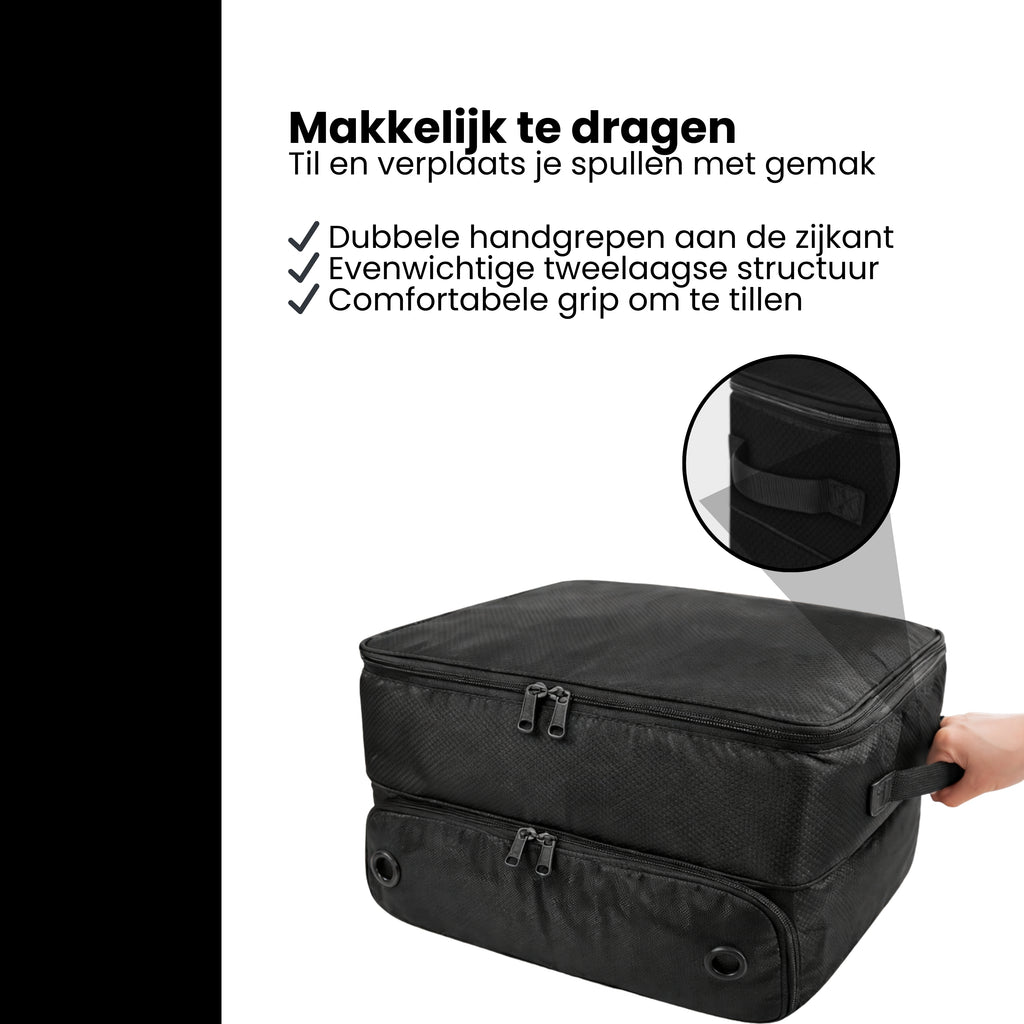 * Handige opbergvakken met rits in de deksel