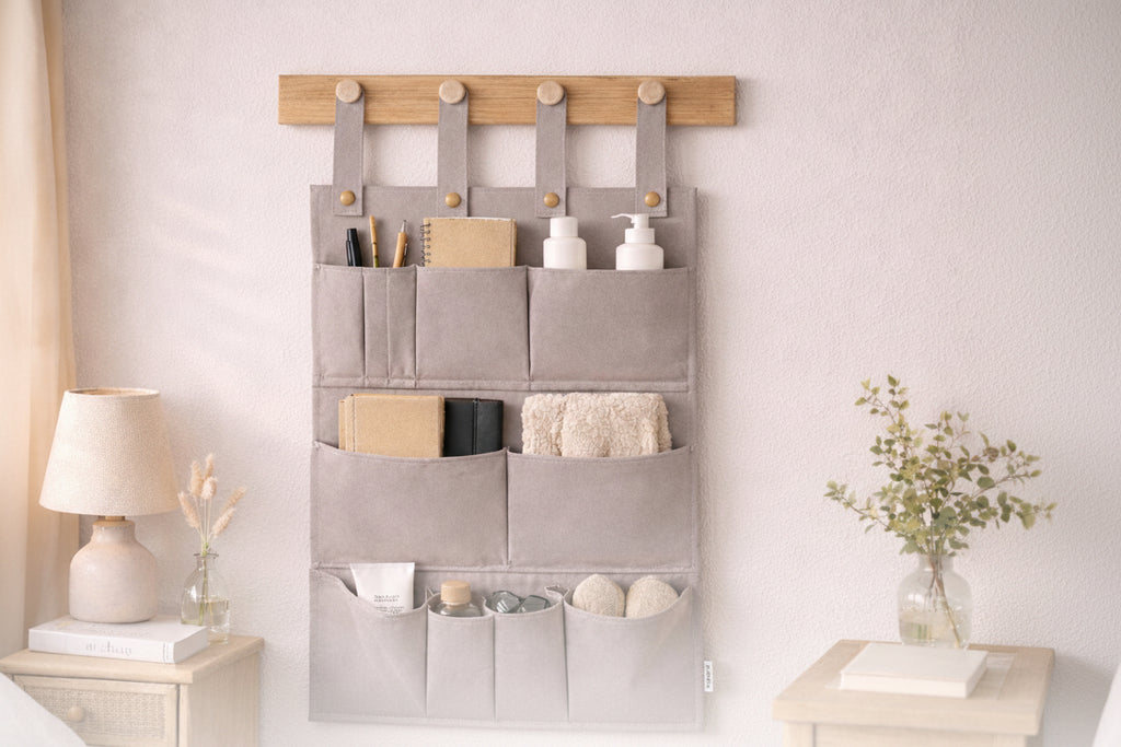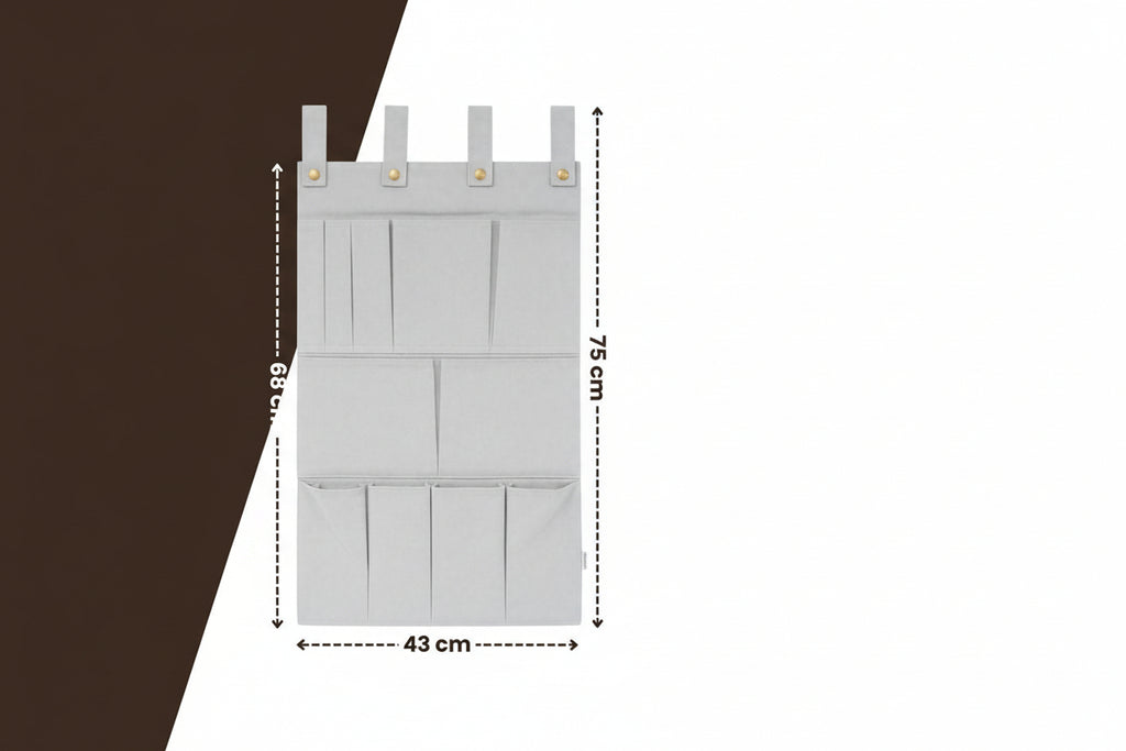 De organizer is uitgevoerd in een mooie, zachte beige kleur en past perfect in elk interieur – van modern tot Scandinavisch. Of je hem nu aan de muur, kastdeur of bedrand hangt, deze organizer voegt rust toe aan elke ruimte.