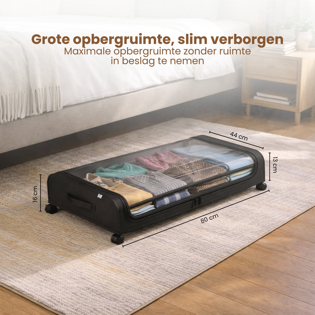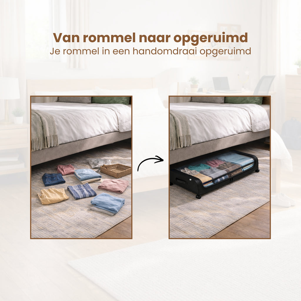 Met deze onderbed opbergbox benut je elke centimeter van je ruimte optimaal en houd je jouw spullen netjes uit het zicht, maar altijd binnen handbereik. Een slimme keuze voor iedereen die efficiënt wil opbergen en tegelijkertijd rust en overzicht in huis wil behouden.