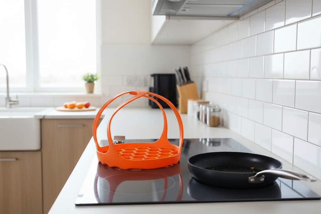 Der Pfannenhalter hat einen Durchmesser von 20 cm und ist somit für mittelgroße Töpfe geeignet. Sie müssen sich keine Sorgen machen, dass die Pfanne aus dem Halter fällt. Dank des erhöhten Randes bleibt es fest an Ort und Stelle. Der Pfannenhalter besteht aus Silikon. Dadurch ist es leicht und leicht zu reinigen.