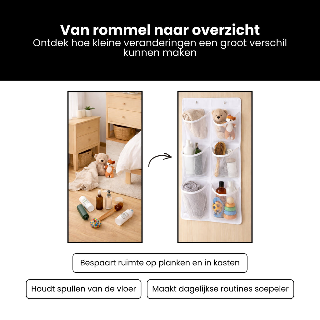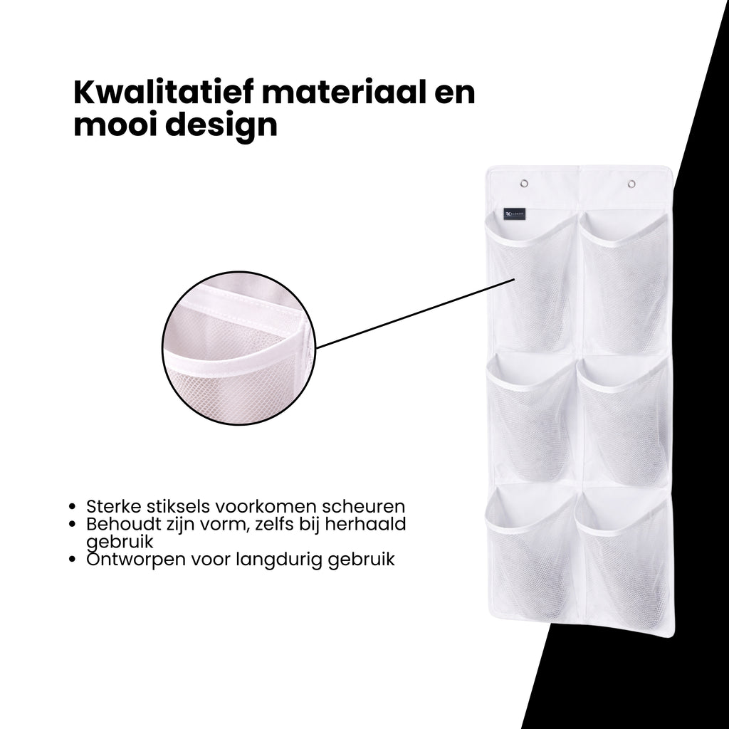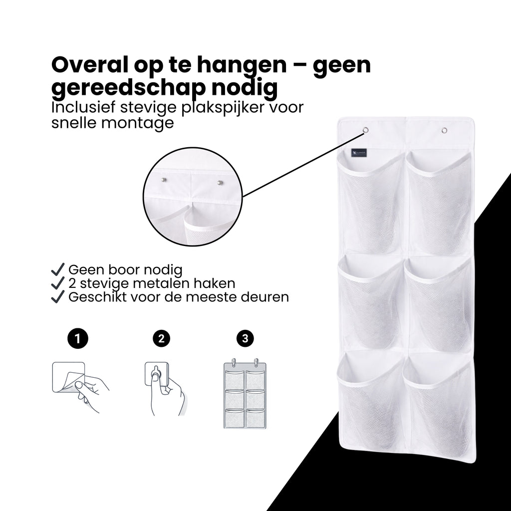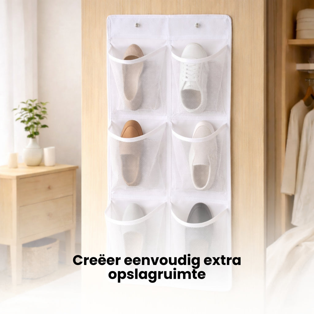 Deze schoenenzak kan met behulp van de deurhaken worden opgehangen aan de deur of in je kledingkast. De zak heeft 6 vakjes. Ideaal om je schoenen te beschermen tegen vuil, stof, vocht en bacteriën. Ook handig om sokken, kleding enz. op te bergen. Daarnaast biedt deze schoenenzak overzicht, zodat je ook de schoenen die je niet vaak draagt nooit uit het oog verliest.