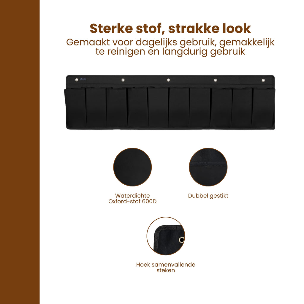 De stevige constructie en dubbele stiknaden zorgen ervoor dat de organizer een belasting tot maximaal 18 kg aankan. Hierdoor kun je niet alleen lichte items, maar ook zwaardere voorwerpen veilig opbergen zonder dat de organizer doorzakt.