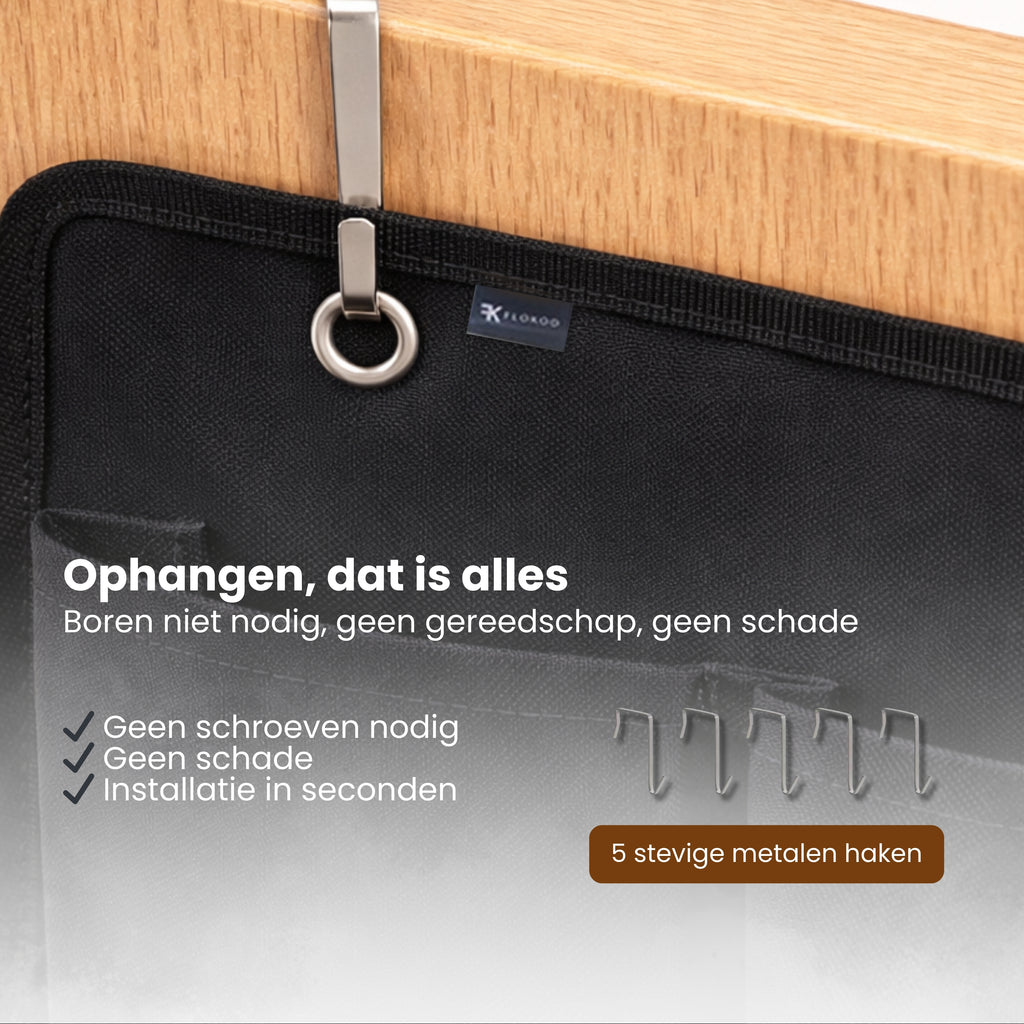 Dankzij de vijf stevige metalen haken hang je de bed organizer direct aan de bedrand. Je hebt geen gereedschap nodig en voorkomt schade aan je bed of muur. Binnen enkele seconden is de organizer klaar voor gebruik, ideaal voor huurwoningen of studentenkamers.