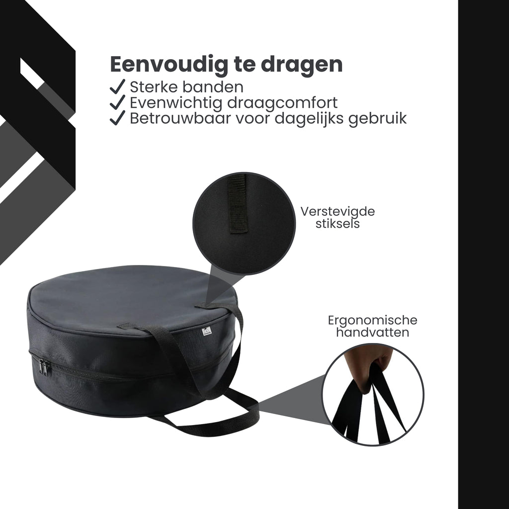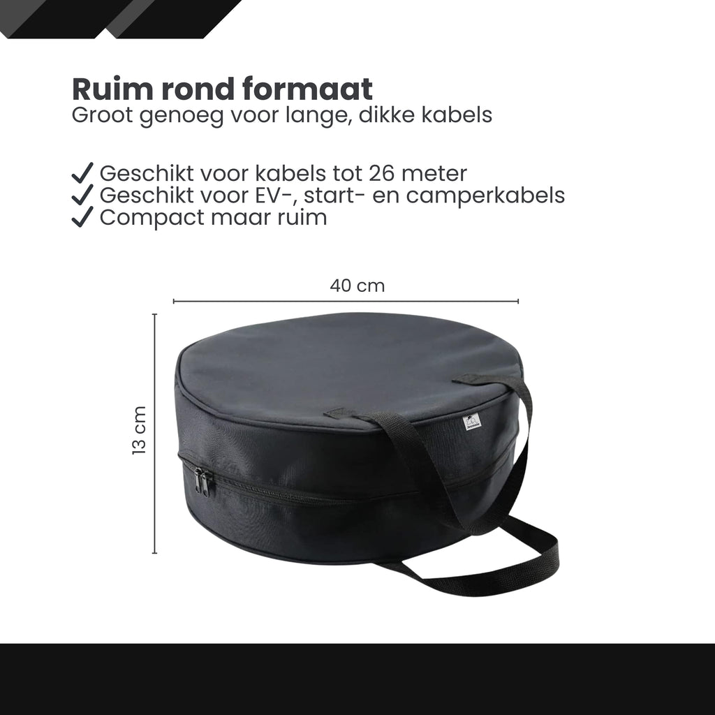 Met een diameter van circa 40 cm en een hoogte van 13 cm is de tas compact genoeg om weinig ruimte in te nemen, maar groot genoeg voor een volledige laadkabelset. Het ronde ontwerp voorkomt scherpe hoeken en maakt het opbergen extra praktisch.