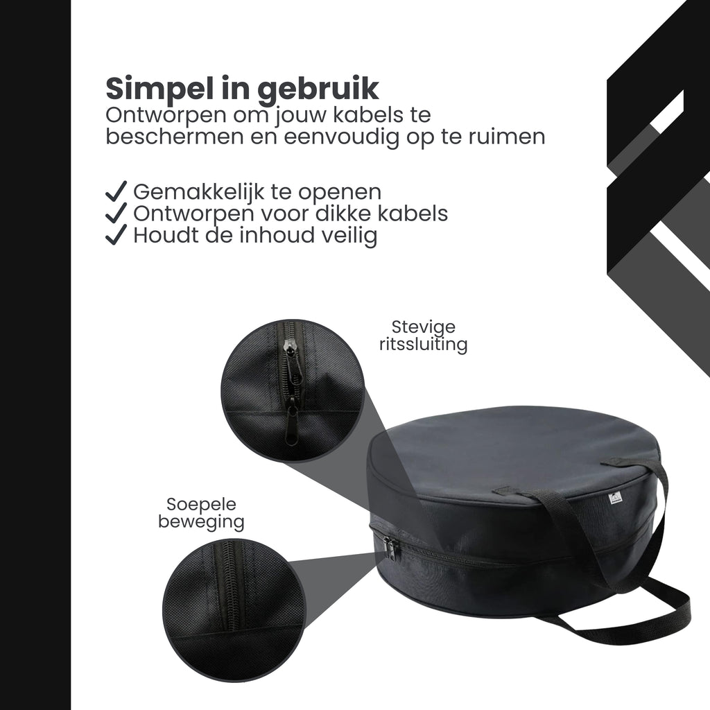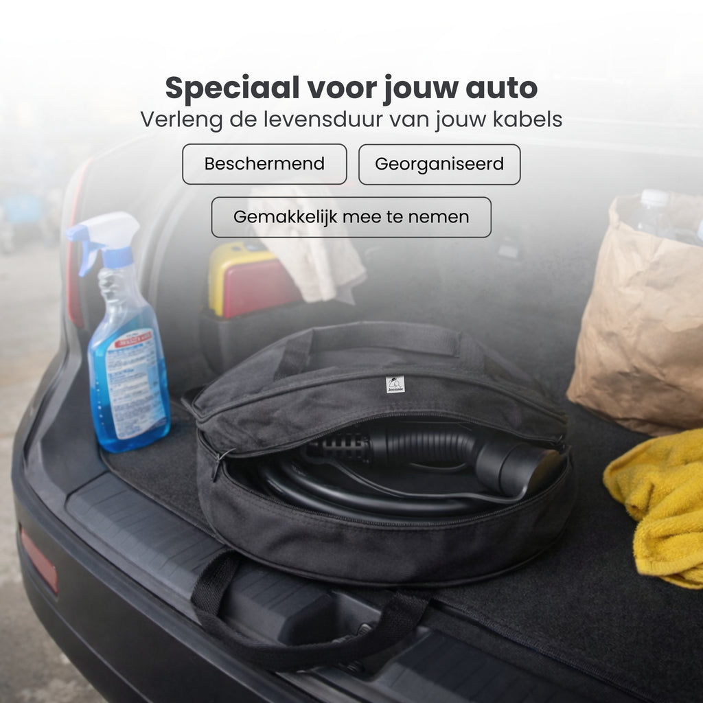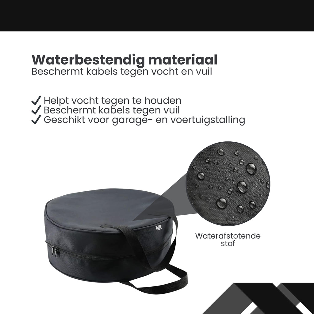 De tas is gemaakt van stevig, waterafstotend materiaal dat je kabels beschermt tegen vocht, stof en vuil in de kofferbak of garage. Dit helpt de levensduur van je kabels te verlengen en voorkomt onnodige slijtage of beschadiging.