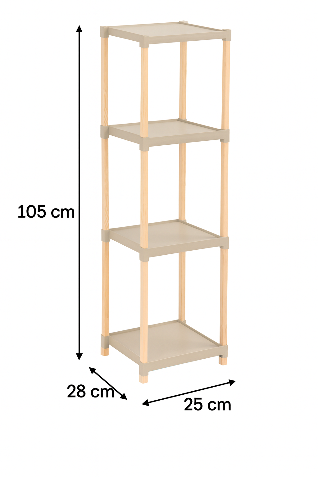 De zachte beige kleur gecombineerd met het natuurlijke hout geeft dit rek een warme en rustige uitstraling. Gebruik het in de badkamer om handdoeken op te stapelen, in de keuken om kruiden en oliën te bewaren of in de woonkamer om planten te presenteren. Dankzij het open ontwerp oogt de ruimte groter en lichter.