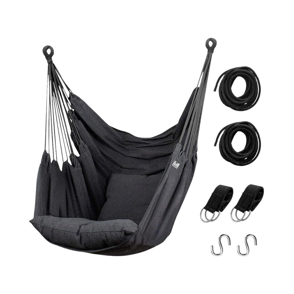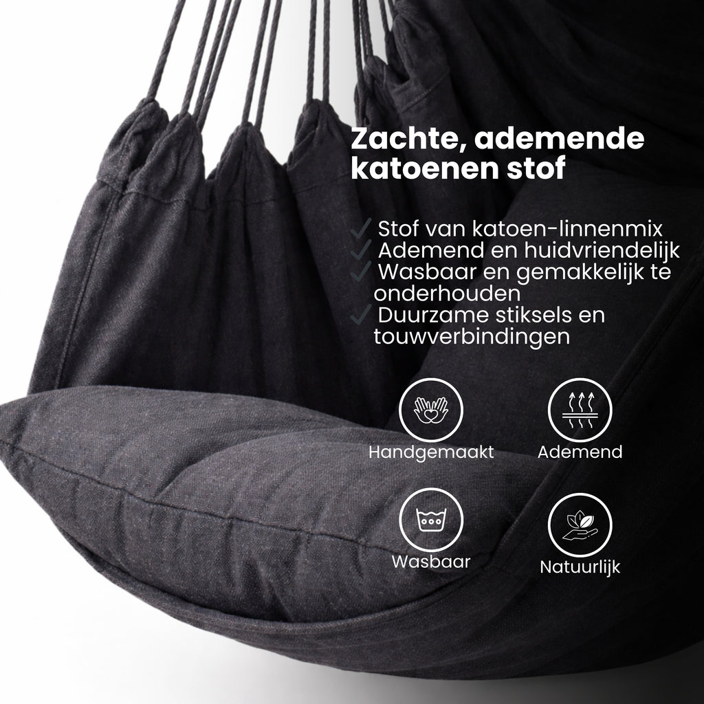 Deze comfortabele hangstoel met kussen biedt dé oplossing: een stijlvolle, ruimtebesparende en heerlijk zachte zitplek die je eenvoudig ophangt waar jij wilt. Dankzij de stevige katoenen stof, het ergonomische ontwerp en de complete ophangset geniet je binnen én buiten van ultiem comfort en ontspanning.