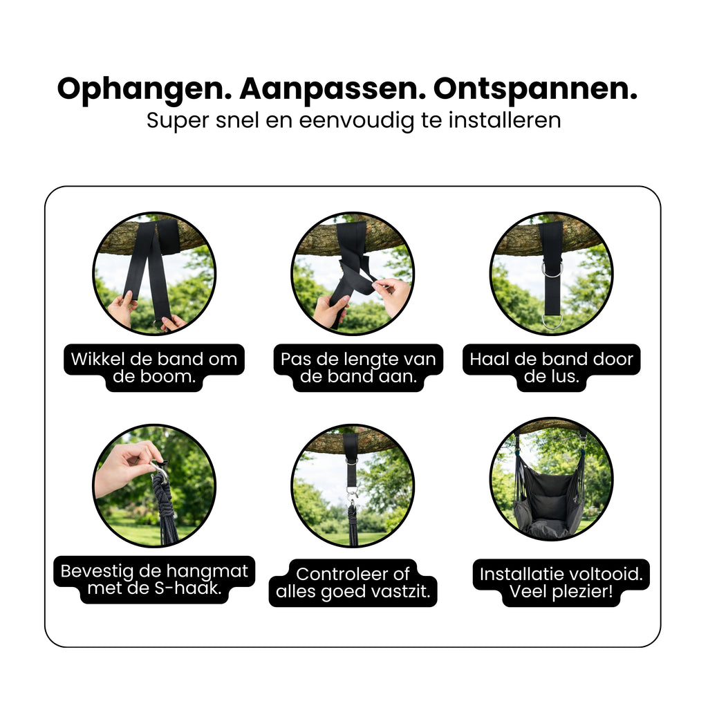 Geen gedoe met losse onderdelen of ingewikkelde montage. Deze hangstoel wordt geleverd met stevige ophangbanden, touwen en metalen S-haken. Hierdoor hang je de stoel eenvoudig op aan een boom, plafondhaak of balk. De verstelbare banden maken het mogelijk om de hoogte perfect af te stemmen op jouw ideale zithouding.