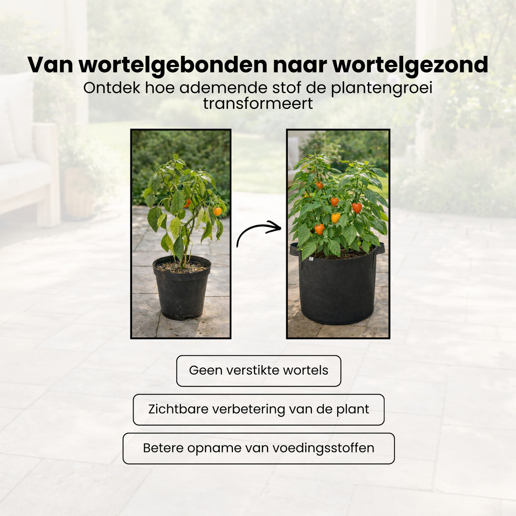 Heb je last van planten die slecht groeien, wortels die in een cirkel blijven draaien of potten die snel scheuren of te klein blijken? Veel traditionele plastic plantenpotten beperken de wortelontwikkeling, waardoor planten minder sterk worden en minder voedingsstoffen opnemen. Dat resulteert in langzamere groei, zwakkere planten en uiteindelijk minder opbrengst in je tuin, balkon of kas.