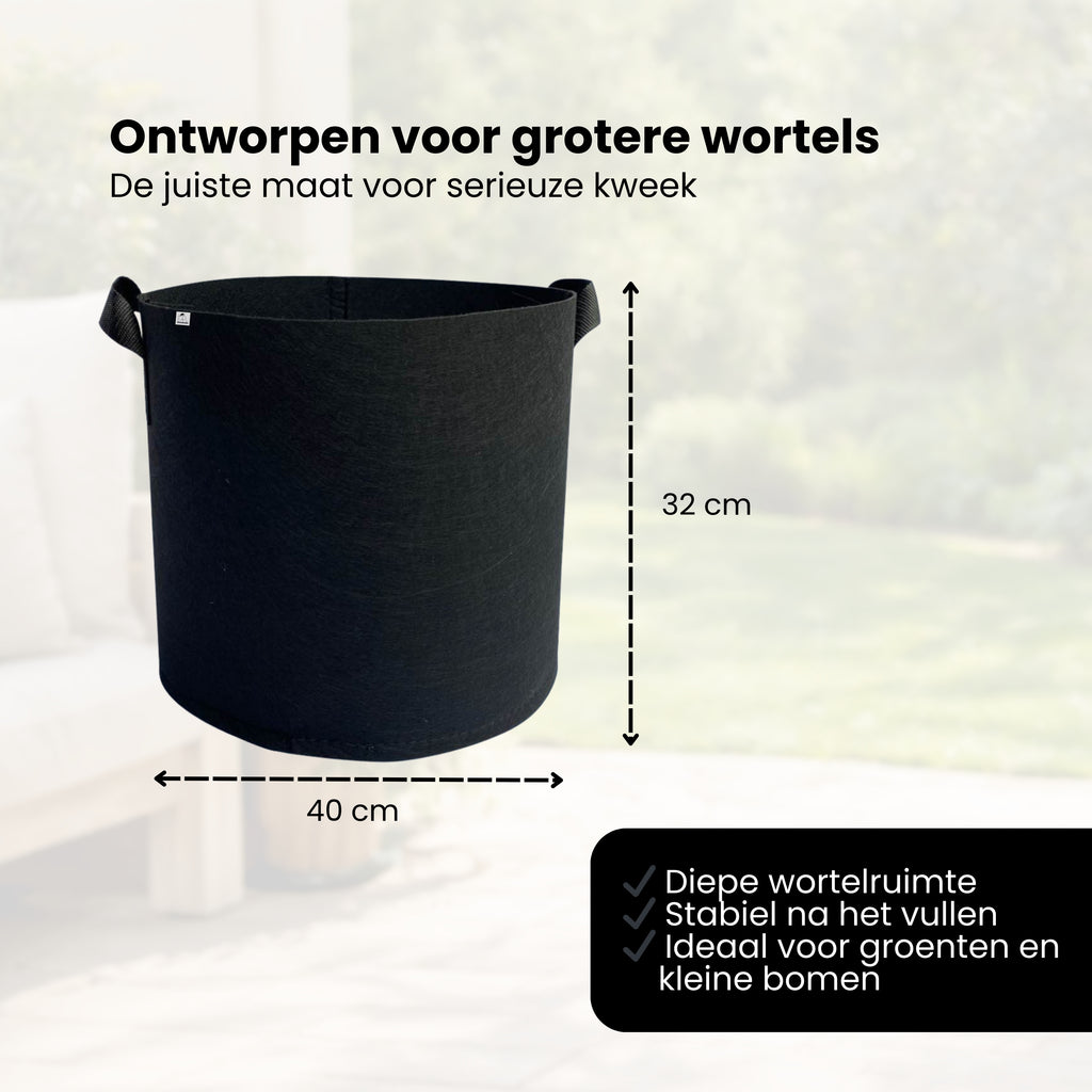 De hoogwaardige ademende stof laat lucht door tot aan de wortels. Dit stimuleert natuurlijke wortelvertakking en zorgt voor een krachtiger wortelstelsel. Gezonde wortels nemen meer water en voedingsstoffen op, wat direct bijdraagt aan een sterkere plant en betere opbrengst.