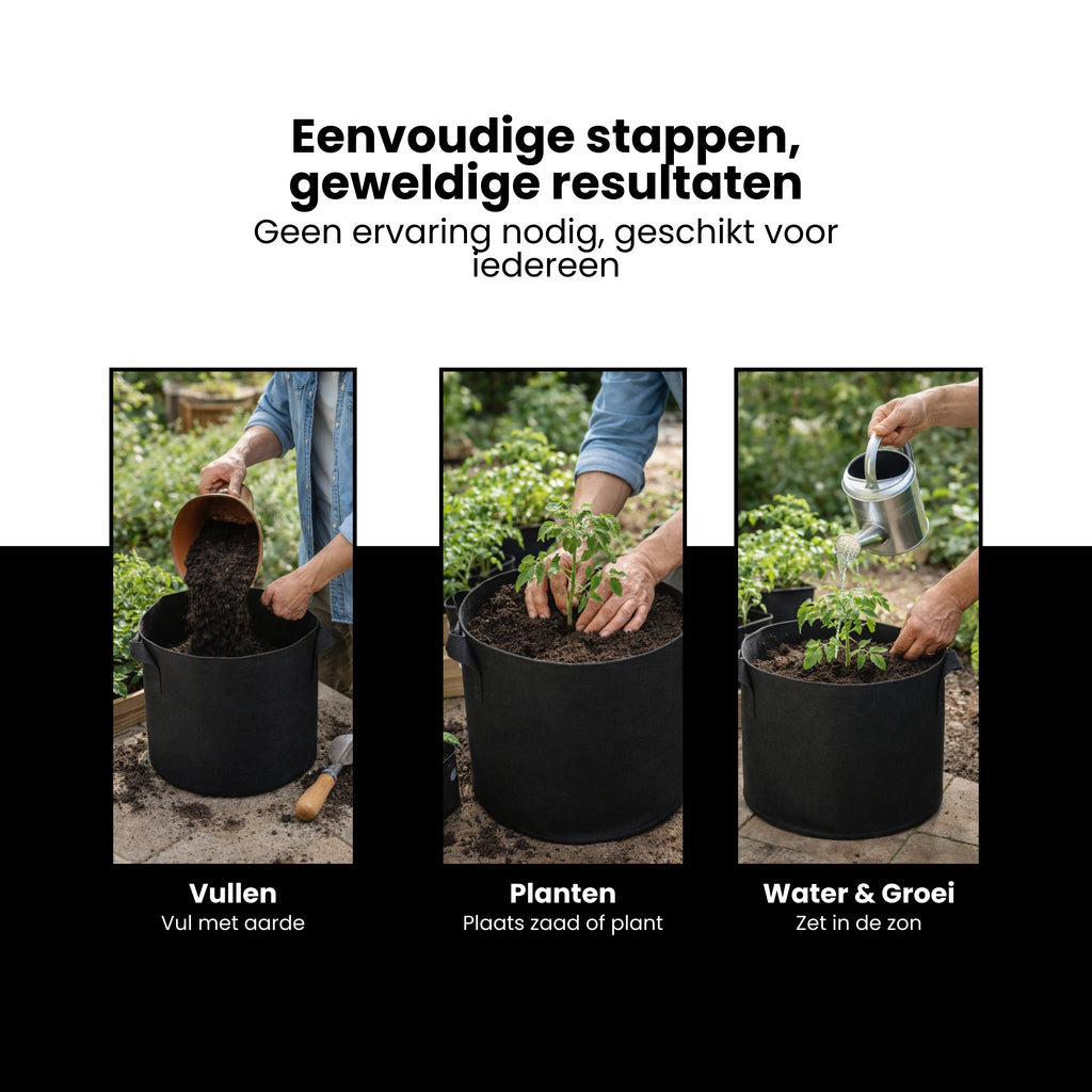 De geïntegreerde handgrepen maken het verplaatsen van je planten eenvoudig, zelfs wanneer de zak gevuld is met aarde. Ideaal voor het herschikken van je tuin, balkon of kas, of om planten tijdelijk te verplaatsen bij veranderend weer.