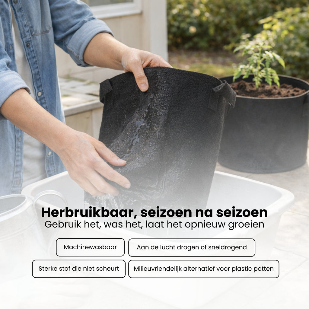 Deze stoffen kweekpot is wasbaar en herbruikbaar, waardoor je hem seizoen na seizoen opnieuw kunt gebruiken. Zo verminder je plastic afval en kies je voor een duurzamere oplossing zonder in te leveren op kwaliteit of stevigheid.