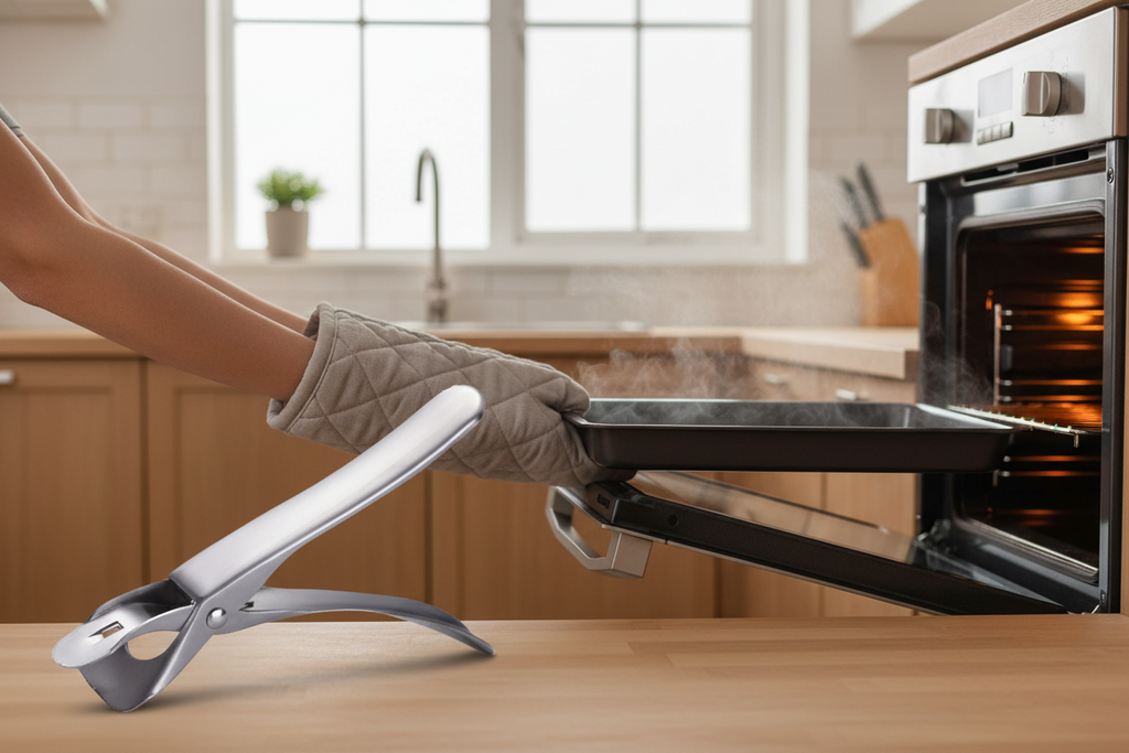 Met de handige Oventang pak jij voortaan zonder je handen te verbranden hete borden en bakjes uit de oven.