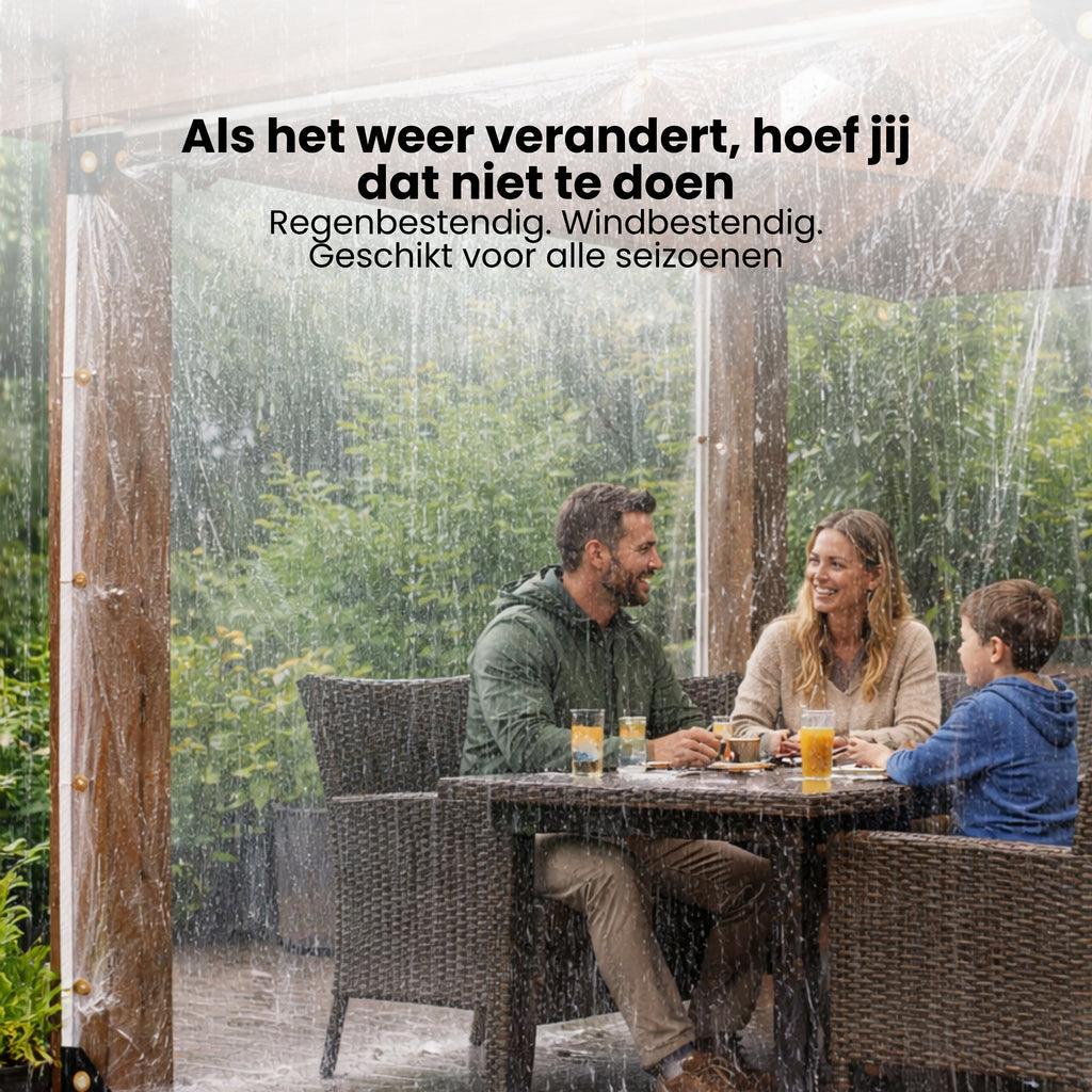 Veel mensen met een overkapping, veranda, terras of pergola herkennen dit probleem: zodra het weer omslaat, wordt buiten zitten minder comfortabel. Regen slaat naar binnen, wind zorgt voor tocht en meubels worden nat of vies. Traditionele zeilen blokkeren vaak het licht en het uitzicht, waardoor je buitenruimte donker en afgesloten aanvoelt.